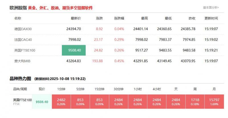 英国富时100指数10月8日(周三)开盘上涨21.67点,涨幅0.23%,报9505.25点;
