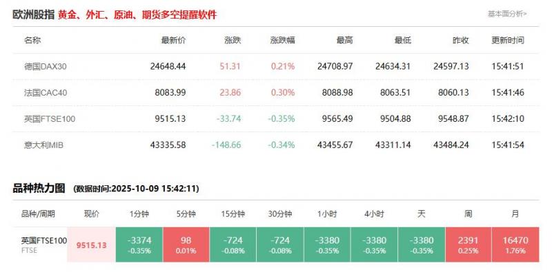 意大利富时MIB指数10月9日(周四)开盘下跌52.24点,跌幅0.12%,报43432.00点。