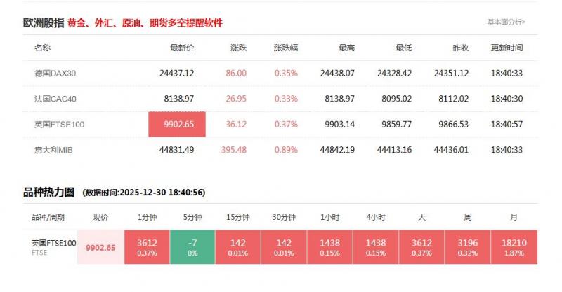 意大利富时MIB指数12月30日(周二)开盘上涨45.49点,涨幅0.10%,报44481.50点;