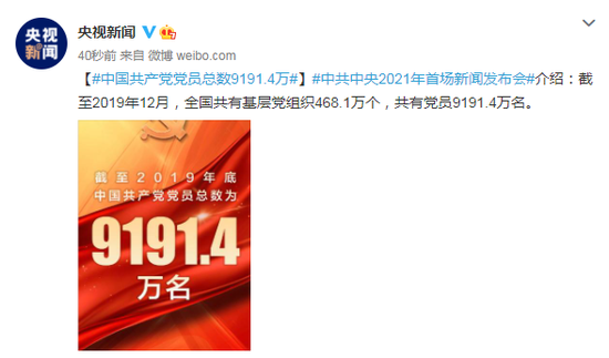 中共中央2021年首场新闻发布会介绍:截至2019年12月,全国共有基层党组织468.1万个,共有党员9191.4万名。