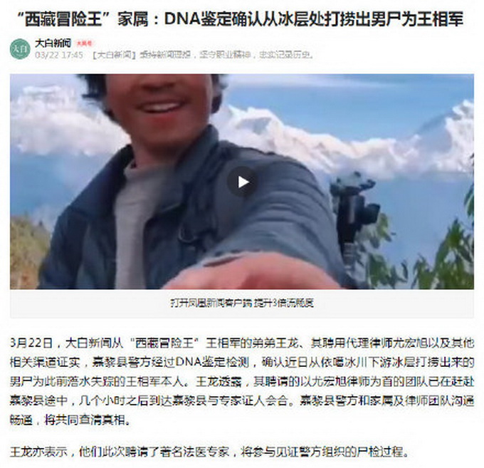 3月22日,嘉黎县警方经过DA鉴定检测,确认近日从依噶冰川下游冰层打捞出来的男尸为此前落水失踪的王相军本人。王龙透露,其聘请的以尤宏旭律师为首的团队已在赶赴嘉黎县途中,几个小时之后到达嘉黎县与专家证人会合。嘉黎县警方和家属及律师团队沟通畅通,将共同查清真相。王龙亦表示,他们此次聘请了著名法医专家,