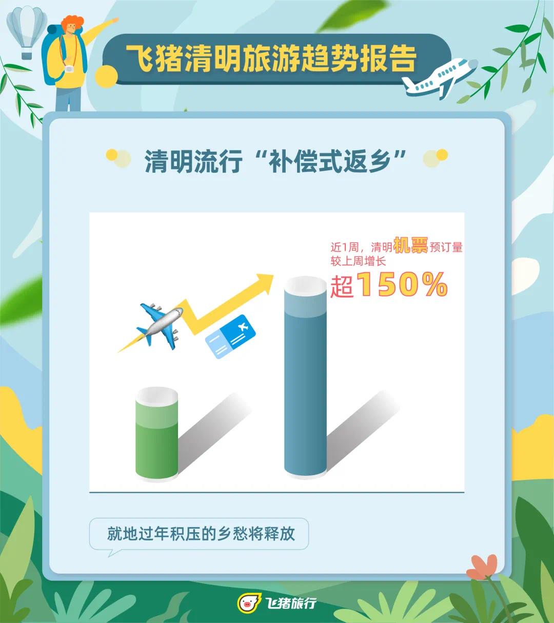 从3月16日零时起,低风险地区人员可凭“绿码”全国自由通行,带来清明节拼假回家的“补偿式返乡”人群激增。 3月19日,飞猪发布《清明旅游趋势报告》(以下简称“报告”)。根据数据显示,近1周飞猪清明机票预订量较上周增长超150%,跨省长线游预订量较前一周增长超170%。周边游赏花踏春也是消磨清明小长假的好