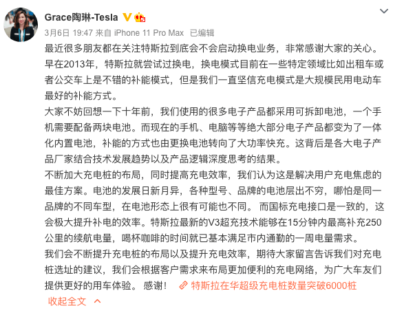 日前,特斯拉(上海)有限公司经营范围新增“新能源汽车换电设施销售”。有媒体报道称,特斯拉此举或许是想进入换电市常对此,特斯拉对外事务副总裁陶琳于3月6日通过个人微博发文对此进行回应。她表示,早在2013年,特斯拉就尝试过换电,换电模式目前在一些特定领域比如出租车或者公交车上是不错的补能模式,但是我们