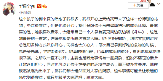 华晨宇微博发文,称是的,“我们”有一个孩子。