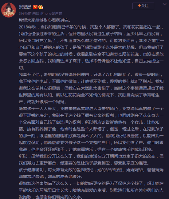 22日,@华晨宇yu@张碧晨发文承认有一个孩子。刚刚,华晨宇工作人员回应表示,“感谢关注,花花目前单身。双方将在无婚姻关系的前提下共同抚养孩子、一起参与孩子的成长过程。”