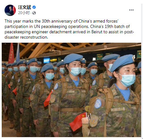 8月3日,中国外交部发言人汪文斌开通了他的官方脸书账号,在9月29日发布的最新帖文中,汪文斌介绍了中国维和部队前往贝鲁特协助灾后重建的消息。他在帖文中写道:“今年是中国军队参加联合国维和行动30周年。中国第19批维和工兵分队抵达(黎巴嫩)贝鲁特协助(当地)灾后重建。” 最初开通账号时,汪文斌曾在帖
