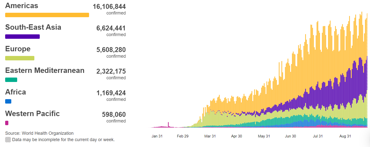 当地时间9月26日,世卫组织发布全球各地区疫情数据,全球新增316884例新冠肺炎确诊病例,新增5786例死亡病例。疫情最为严重的美洲区域确诊病例达到16106844例(新增118938例),死亡543883例(新增3109例)。
