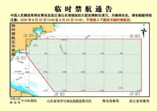 中国人民解放军定于8月22日至8月26日,在青岛至连云港以东海域组织大型实弹射击演习。为确保安全,请各船舶特别注意:2020年8月22日12:00至8月26日12:00,不得进入以下5点连线围成的临时禁航区: 北纬35度55分00秒,东经119度55分00秒 北纬35度55分00秒,东经123度00分00秒 北纬34度30分00秒,东经123