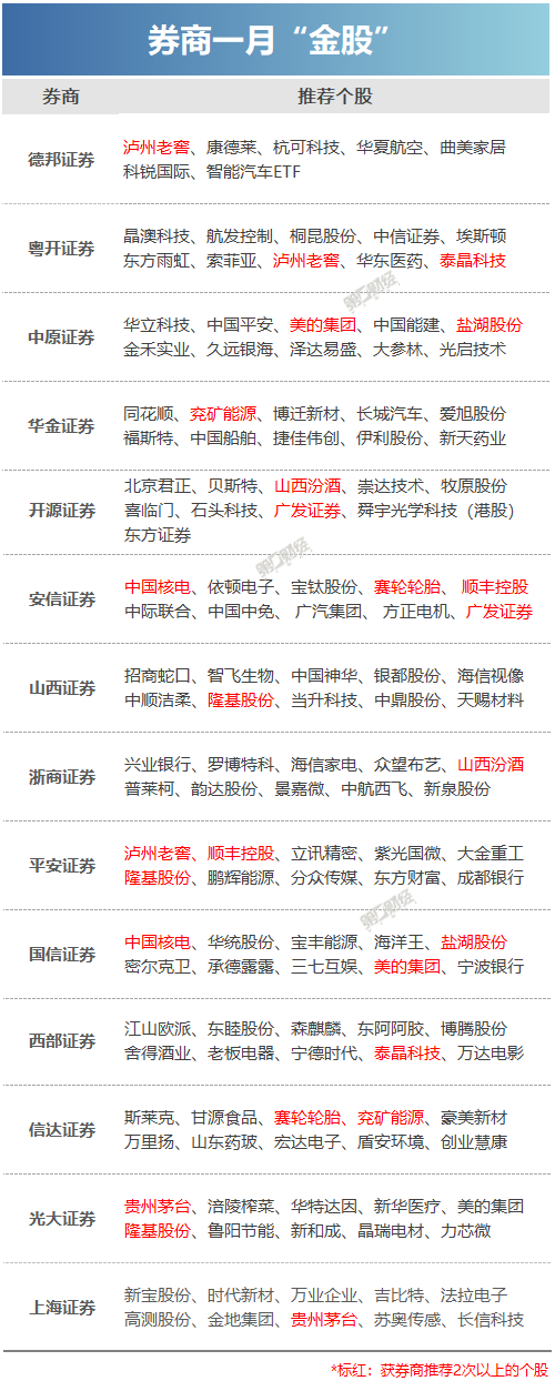 2021年最后一个交易日,A股市场红盘收官,全年来看,沪指累计涨4.80%。新年1月如何寻找机会?截至去年12月31日,有14家券商公布了1月月度投资组合,涉及食品饮料、化工、电气设备等多个领域。 哪些个股收获点名最多? 据不完全统计,在各家券商的“金股”名单中,获机构推荐次数最多的是隆基股份