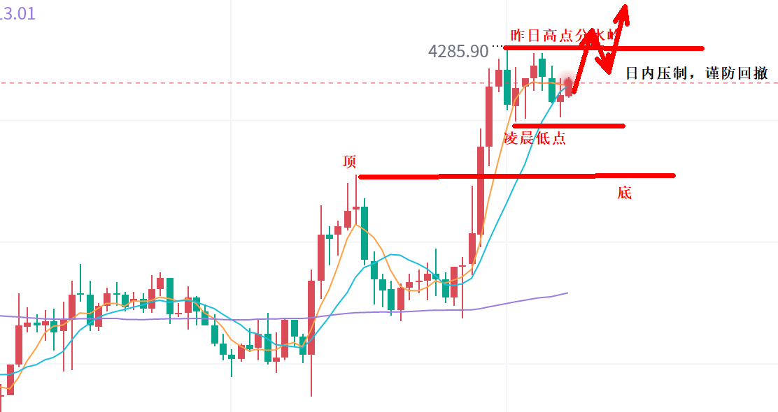 而能否破高取决于欧盘,欧盘突破前一日高点4285,美盘多一次。