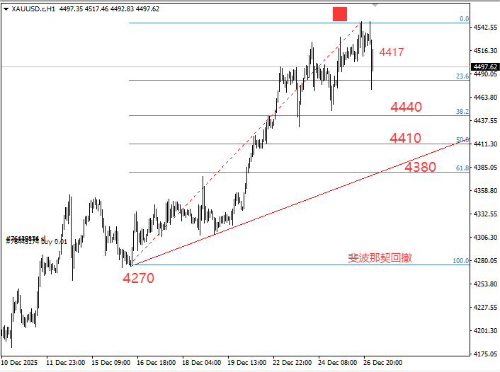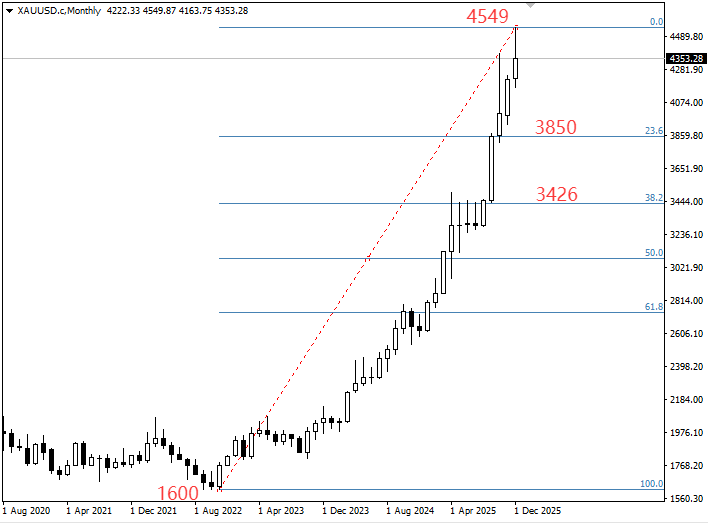 从上图看,黄金从1600美金涨到4549美金,这轮黄金牛市上涨了2.84倍,期间虽有多次短期波动,但从未打破核心趋势框架。根据斐波那契回撤理论,一轮健康的上升趋势中,23.6%是强弱分水岭,38.2%是趋势关键防线。对应本次行情计算,23.6%回撤位精准落在3850美金,38.2%回撤位则在3426美金。而当前金价的回调幅度尚不足10%,距离3850美金的关键支撑仍有明显空间,这意味着月线级别的强势上涨结构完全未被破坏。
