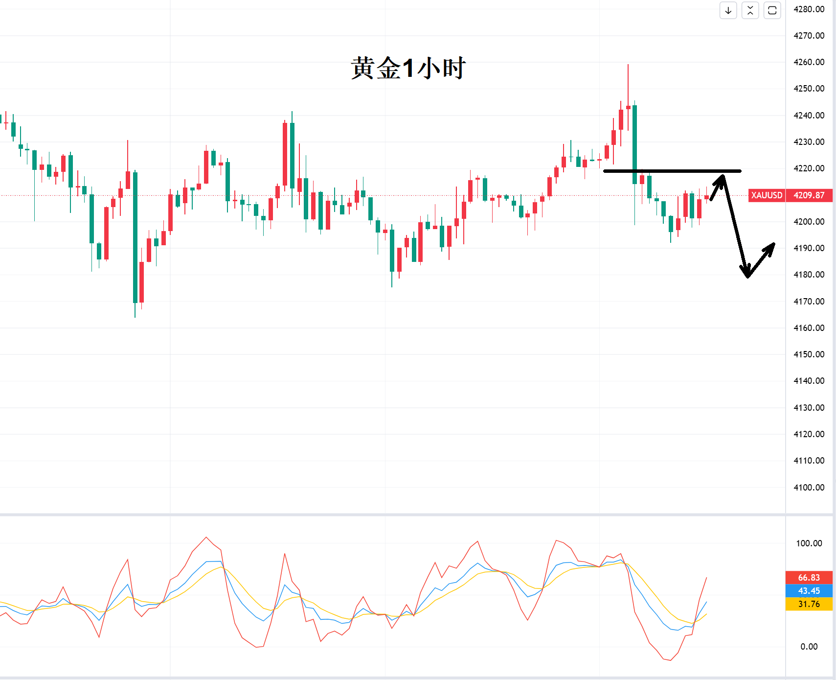 今天,黄金反弹后靠近4220-25美元短空,日线级别四天连收十字K,冲高回落上方4250-60美元抛盘压力较大,向下关注支撑在4185-4180美元,短期震荡看弱势调整,并非否认长期上涨。