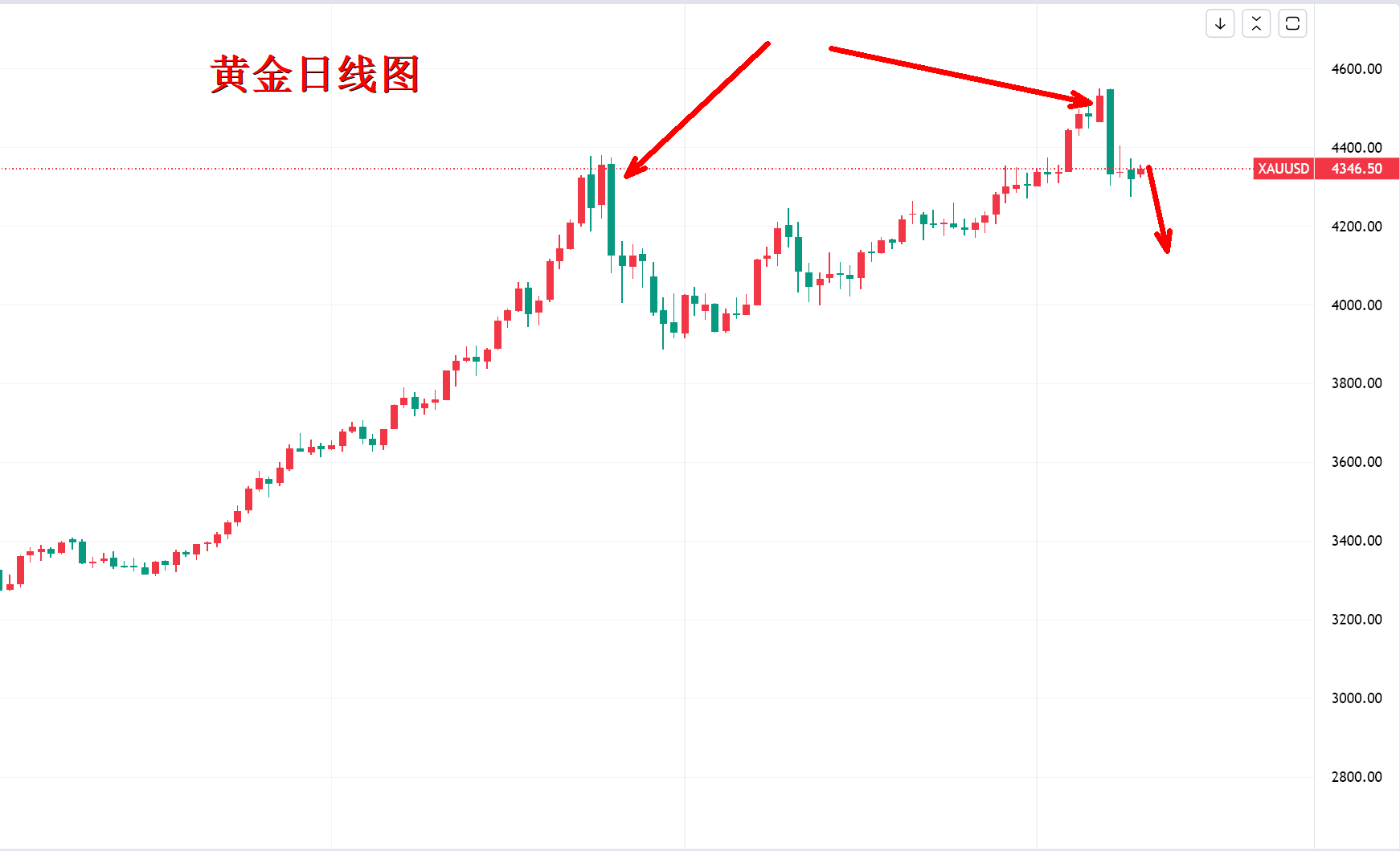 黄金日线级别非常典型调整走势,上一次10月22日大阴线吞没,之后经过震荡后一轮向下跌,这一次同样上周一大阴K线吞没,这明显已经不是单日调整,而是会进入周期性洗盘,4400美元关键性压力,向下修正后为2026年想买入黄金的朋友留足空间和机会。