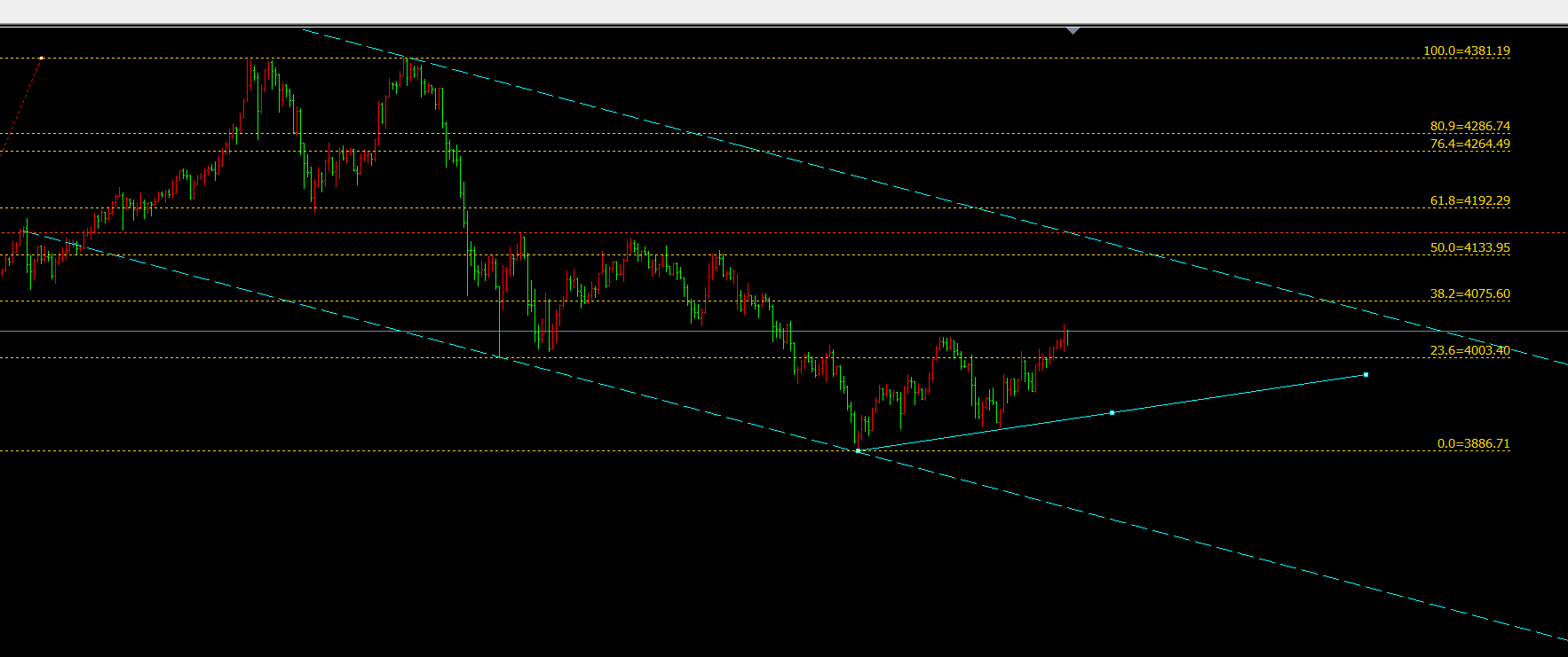 对于今天来看,日图中阳报收,短期日图下线支撑有效,后市有望测试上图两道压制4075-82为一个档,另外就是低点反弹的外沿线4135一线,而当下重点是对于今天的切入点,四小时价格已经站上了短期均线上方,但是在四小时上线附近有明显的压制,小时图贴着均线上行,所以接下来有两种情况,一是强势冲破上线,二是回落,但是小时图这种上升很难回落太多,按趋势线来看下方在4007一线,所以以下方为防守上边先入,昨天的第一次高点在就在4012附近,所以这里又成了顶底转换位,中轴位在3990附近,这里正好是30分钟下线与1小时均线共振位,所以今天分两步进行,分段多。