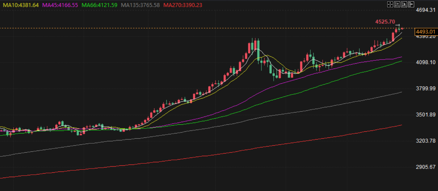 周三金银冲高回落,盘中最高4525.6最低回到4448,收盘以一根带有上下影线的十字阴报收于4479,与早评分析高度一致,从当天盘面来看,早盘跳空高开,白银继续新高,钯金更是直接高开接近一百美元,所以在这个联动下,黄金想出现实质性的下跌不现实,除非出现消息面大的影响,或者连续砸个五百美元的下跌,不过近期基本是亚盘出高点,欧盘修正,晚间再拉,所以今天还是白天空欧美盘找低点再做多。