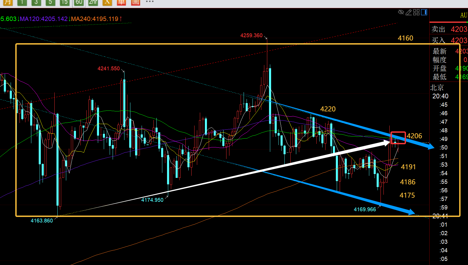 第二,黄金小时线级别:尽管这周走势反复的来回跳跃洗盘,短线入场卡的位置不理想,就容易被市场洗,主要还是三点:要么埋伏点微差几米进不去而踏空,要么到了预期位置不敢出手而踏空,要么出手了就被震荡洗;风水轮流转,上周震荡期做的从从容容,游刃有余;而这周震荡期做的匆匆忙忙,连滚带爬;但相信,只要耐心逮住一个相对极端高位或低位,把握一个波段,什么都可以一次干回来;从上图看,只要价格仍处于红色通道之内运行,上轨无法突破站上,那么最终依然存在向下试探下轨的可能,也只有完成了下轨的测试确认,整个运行过程才算完美,后期可以再震荡拉的更高;同时,4244-4264这两周高点趋势阻力线对应的承压点4270-75是强压,一口气难以直接突破;因此,上方重要压力是4252、4270,中途4232、4241阻力也留意下,而下方重要支撑是4208、4185,都是对应低点趋势连接线; 今晚23点公布PCE,由于非农数据延迟至16日,所以今晚的数据是作为下周四利率公布的最后重要参考数据,值得关注;继续按支撑和阻力之间洗盘震荡对待;