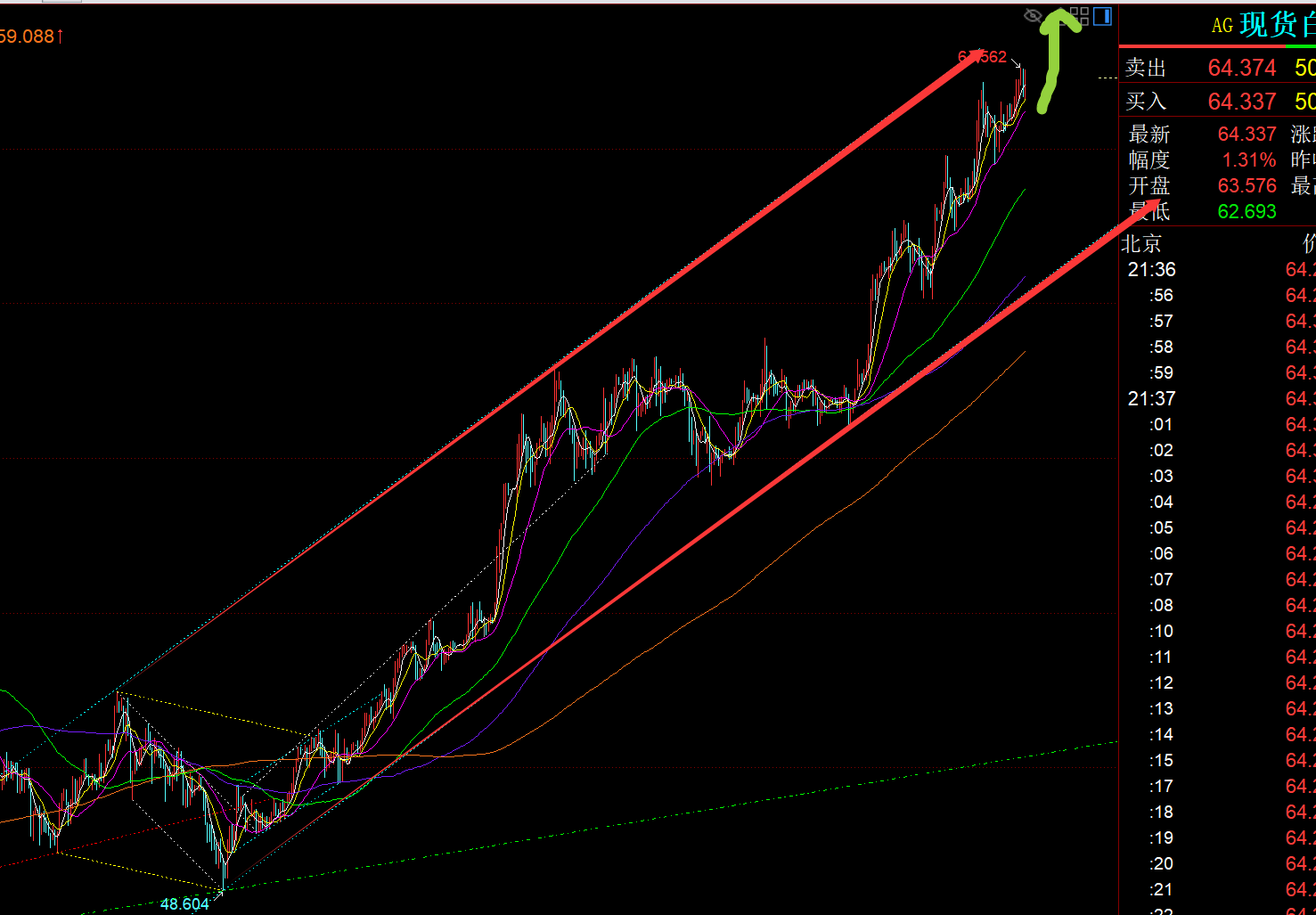 第二,白银方面:从上图通道看,离红色通道上轨还有些空间,触及的位置大概也是对应下一个长线目标66-65.9,既然也是强势维持,就继续看涨为主,尽管短周期macd量能背离,但这轮逼空力度确实很强,还未出现获利盘,就无法很好的打压回踩,也就给不到相对较好的上车补票;今晚63.7支撑,其次是62.7今天低点,阻力66-65.9去看;