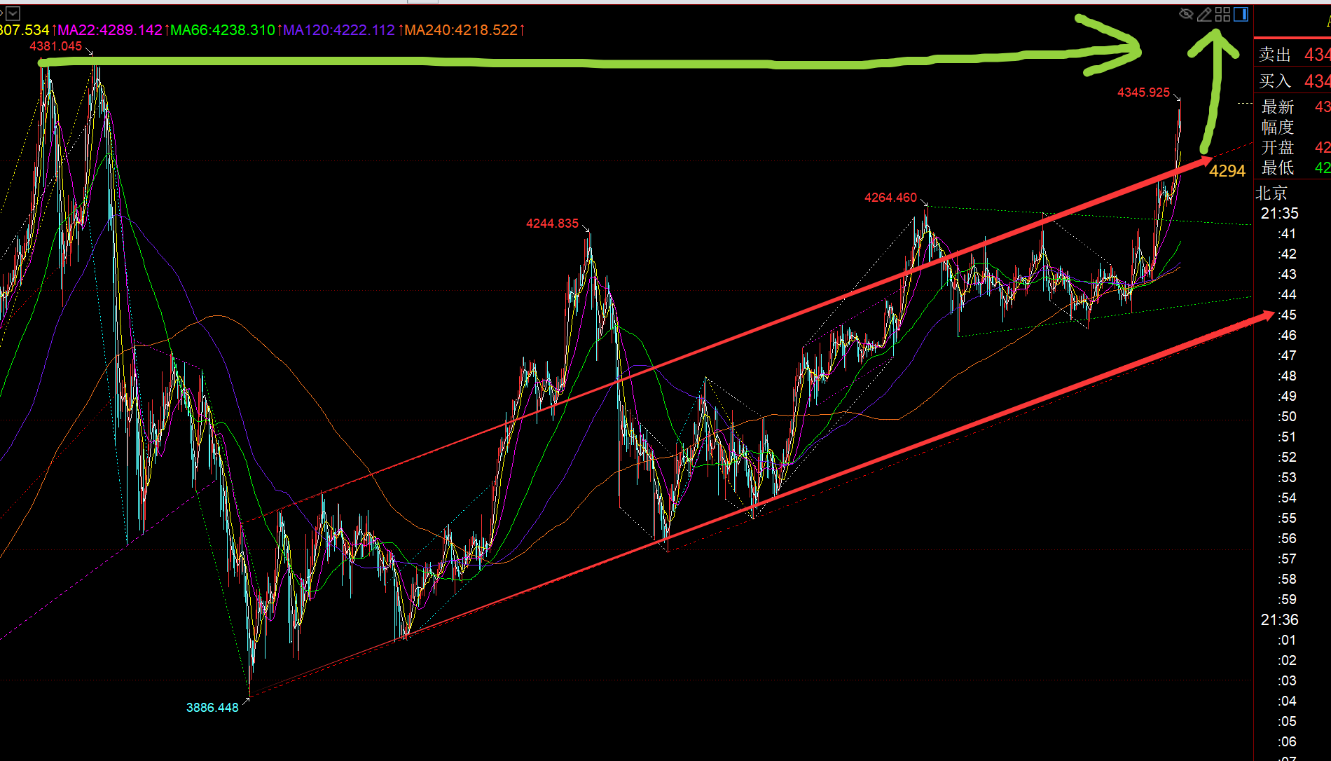 今晚总体上,只要价格维持于红色通道上轨4294之上运行,就看涨为主,不去试探空,因为它已经脱离了前面的震荡区间,不能再按震荡来对待,趋势来了就按趋势去对待,阻力能看到的就是4370-4381前高区域了;