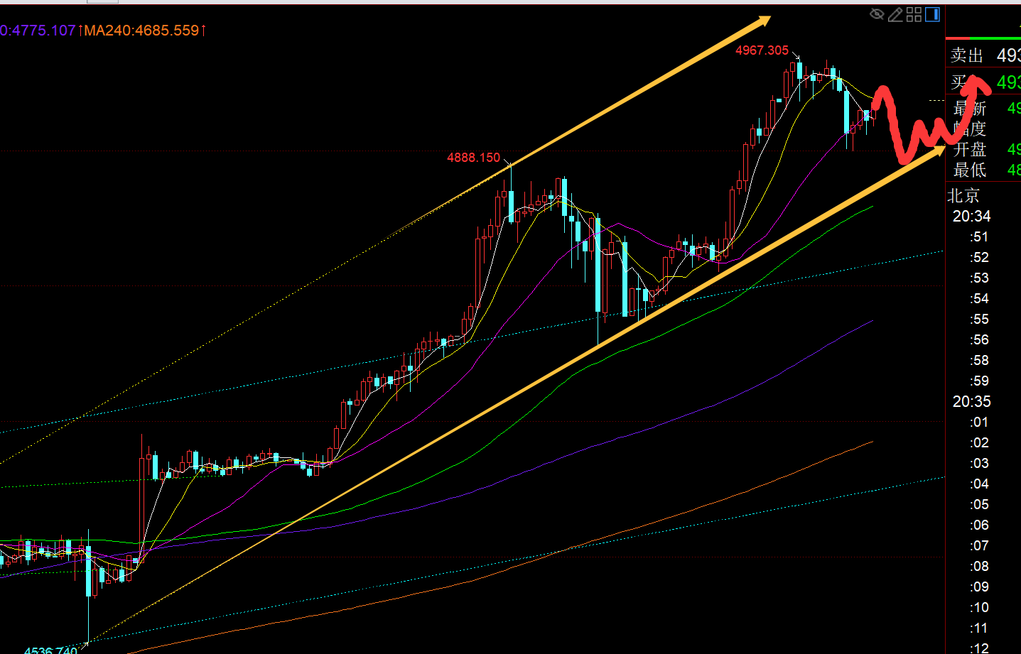 第二,黄金小时线级别:隔夜强势收盘于高位,今日开盘直接续涨一波20-30米,这点在夜间也是提示的,就是要起得早才能把握住;而欧盘向下打压一波,走出高位4936-4967震荡范围,那么欧盘偏弱,美盘前震荡反弹,晚间还可能存在二次下行,再低位企稳夜间探底拉升稳定;因此,上方可留意4940一线上下,它是日内跌幅反抽的618分割阻力,下方支撑4880一线,顶底位置,也是图中黄色通道下轨处,同时靠拢4810-4967的50分割支撑4888,所以今晚预计先抑后扬,整体上依旧北上为主,维持趋势上攻;