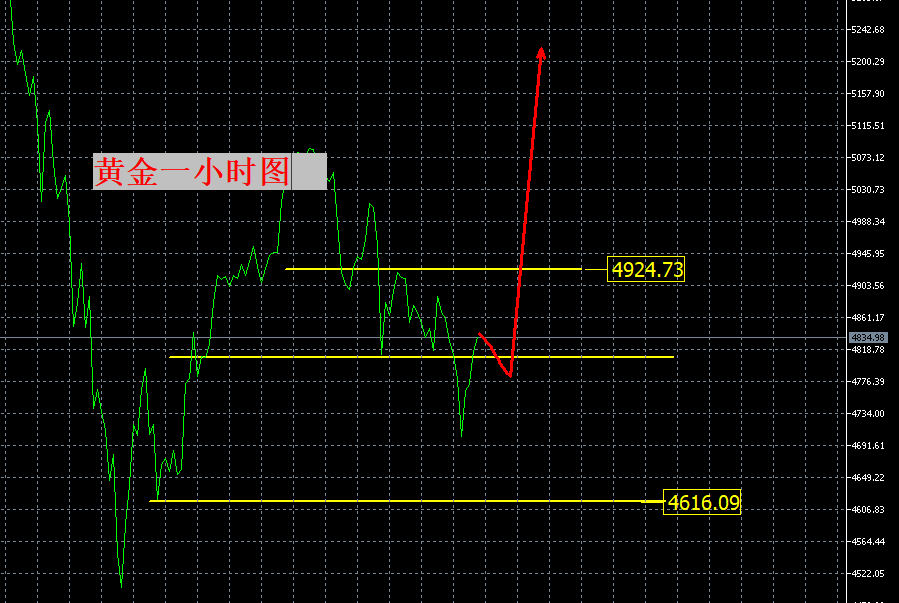 本周一,我们首先强调了4400也就是内盘价格1000是本轮5600高点之后的回调低点。周二也强调了一小时底部结构出现之后要进场,大概区域是在4840区域,也就是内盘价格1080一线。周三黄金价格一度拉升至5100附近,对应的内盘价格1140上方。