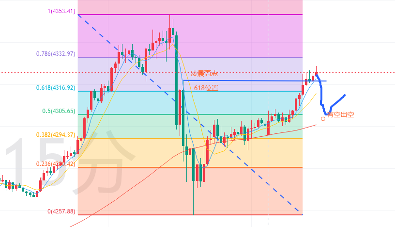 早安,屏幕前的你,在不懂的市场里拿懂的思维去搞钱,结果还是会被搞,任何市场,进之前都要去研究研究市场的属性,不是听一句,就能一直撞大运! 黄金方面,早间开盘上升。打破了两个点: 1,618位置4318,震荡的原则就是围绕618必做。 2,凌晨下跌的次高点,4322,这是极限位,而这个位置