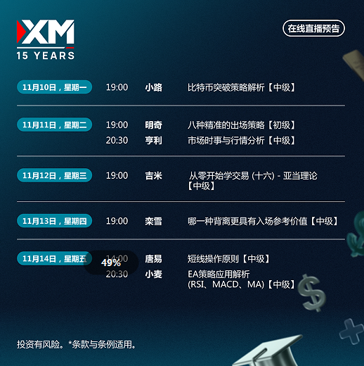 每周一至周五,1小时+实战内容, XM中文直播课堂助你精准把握市场脉动,掌握实战策略与关键出场技巧,提升你的交易胜率!