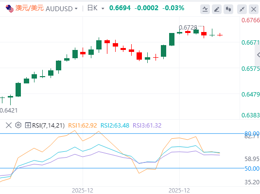 澳元兑美元在心理层面0.6700测试直接关口,紧随其后的是0.6727,这是自2024年10月以来的最高水平,于12月29日达到。若继续上方,将支持该货币对探索上升通道上边界0.6850附近区域。
