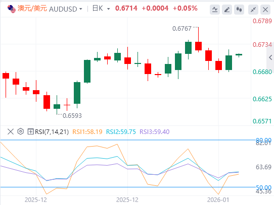 澳元/美元周二交易约0.6710。日线图分析显示该货币对反弹至上升通道,显示出新一轮多头偏向。14天相对强弱指数(RSI)位于60.55,仍位于中线之上,支撑上行动能。