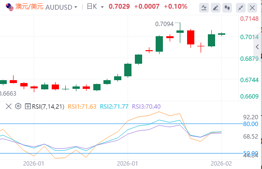 澳元兑美元汇率反弹至0.7094,为2023年2月(1月29日记录)以来的最高水平。若突破该水平,将支持该货币对测试约0.7210附近上行通道边界。下行方面,主要支撑位于九日指数移动平均线(EMA)0.6964,与通道下限对齐。进一步下跌将暴露50日均线,支撑位为0.6759。