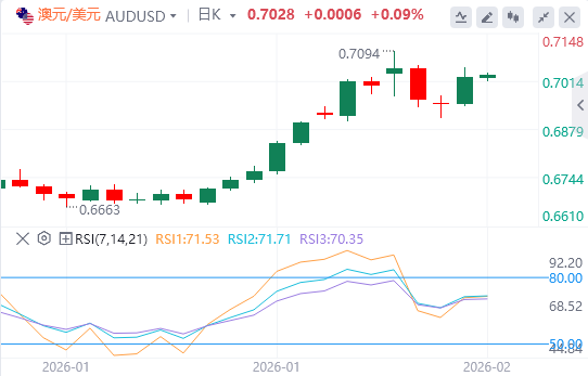 澳元兑美元汇率反弹至0.7094,为2023年2月(1月29日记录)以来的最高水平。若突破该水平,将支持该货币对测试约0.7210附近上行通道边界。下行方面,主要支撑位于九日指数移动平均线(EMA)0.6964,与通道下限对齐。进一步下跌将暴露50日均线,支撑位为0.6759。