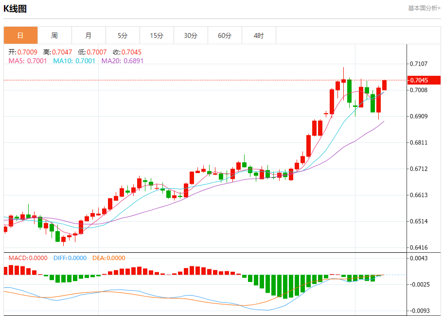 澳元兑美元今日汇率最高0.7034 ,最低0.7033 ,涨跌0.0017 ,涨跌幅0.24% 。