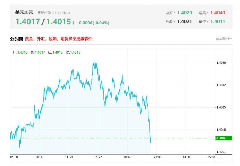 美元兑加元今日汇率最高1.4017 ,最低1.4015 ,涨跌-0.0006 ,涨跌幅-0.04% 。