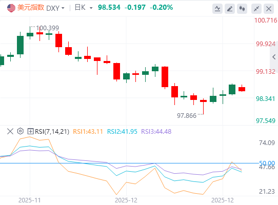 12月22日,美元指数难以延续上周自八月初以来最低水平的反弹,周一欧洲早盘时段呈现轻微负面波动。该指数目前位于98.00多点中段稍高,当天下跌超过0.10%,目前似乎已将三天连胜纪录终结至一周高点,该高点于周五触及。