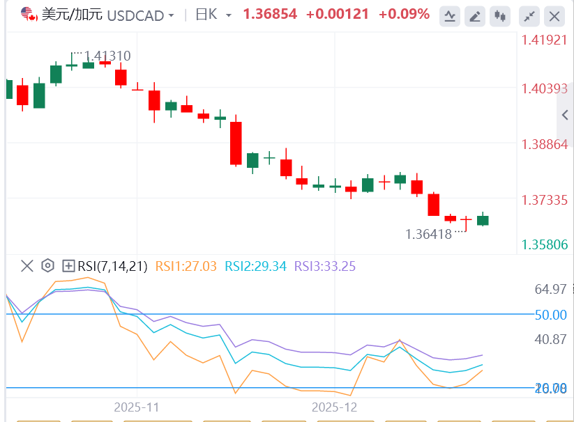 14天相对强弱指数(RSI)位于30.69,接近超卖,且自近期低点有所回升,显示卖压减弱。从1.3540低点测得到1.4139高点,78.6%回撤位1.3668在回调中提供了附近支撑。