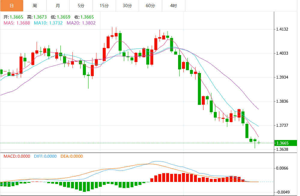 14日相对强弱指数(RSI)为30.69,接近超卖,并从近期低点略有上升,显示出卖压减弱。 从1.3540低点到1.4139高点的78.6%回撤位在1.3668提供了附近支撑。