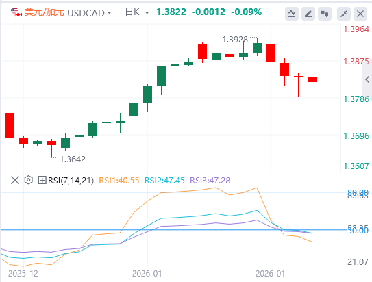 移动平均收敛背离(MACD)在零点附近收敛信号线,而负直方图收缩,强化了中性基调。RSI位于43(中性),正在从超卖中恢复,暗示卖出压力正在减弱。38.2%的斐士。1.3822的水平提供初始支撑;收盘价低于其下方,可能开启50%的Fibo。水平为1.3787。