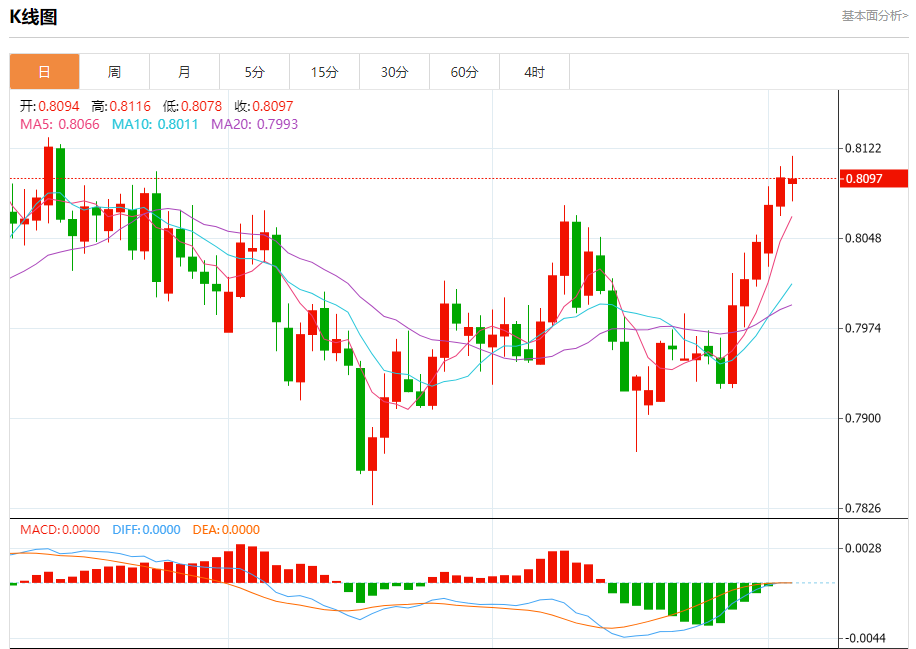 周三纽盘,瑞郎兑美元交投于0.8099,跌幅为0.02%。