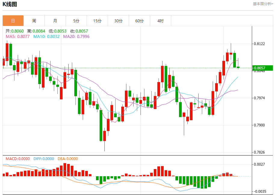 周五纽盘,瑞郎兑美元交投于0.8054,跌幅为0.11%。