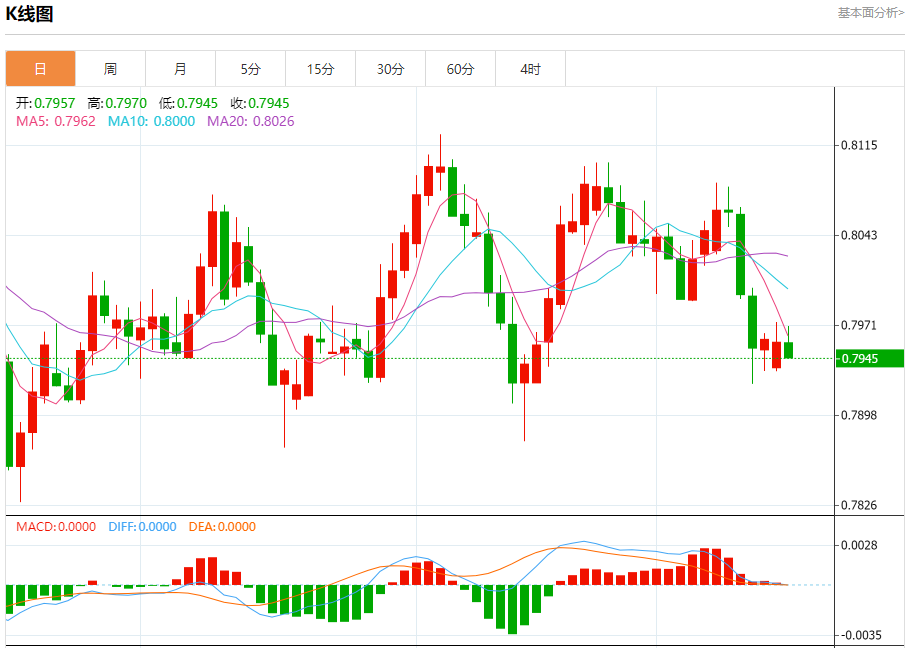 周二纽盘,瑞郎兑美元交投于0.7941,跌幅为0.23%。
