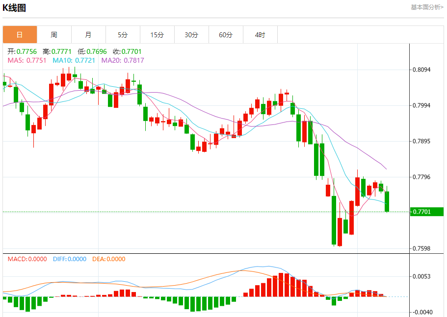 周一纽盘,瑞郎兑美元交投于0.7703,跌幅为0.72%。