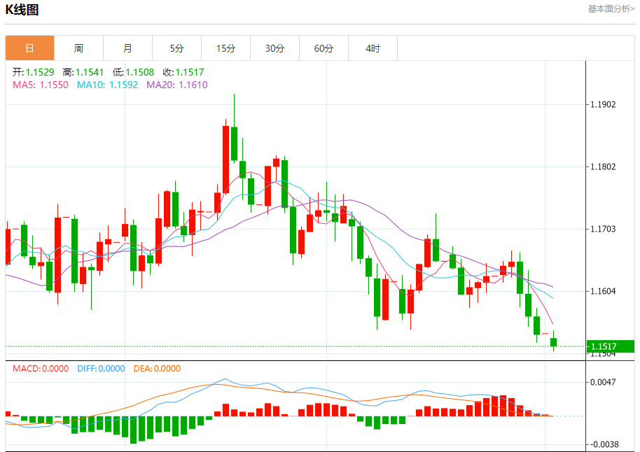 今日周一,截止目前欧元兑美元报1.1517,下跌0.17%。
