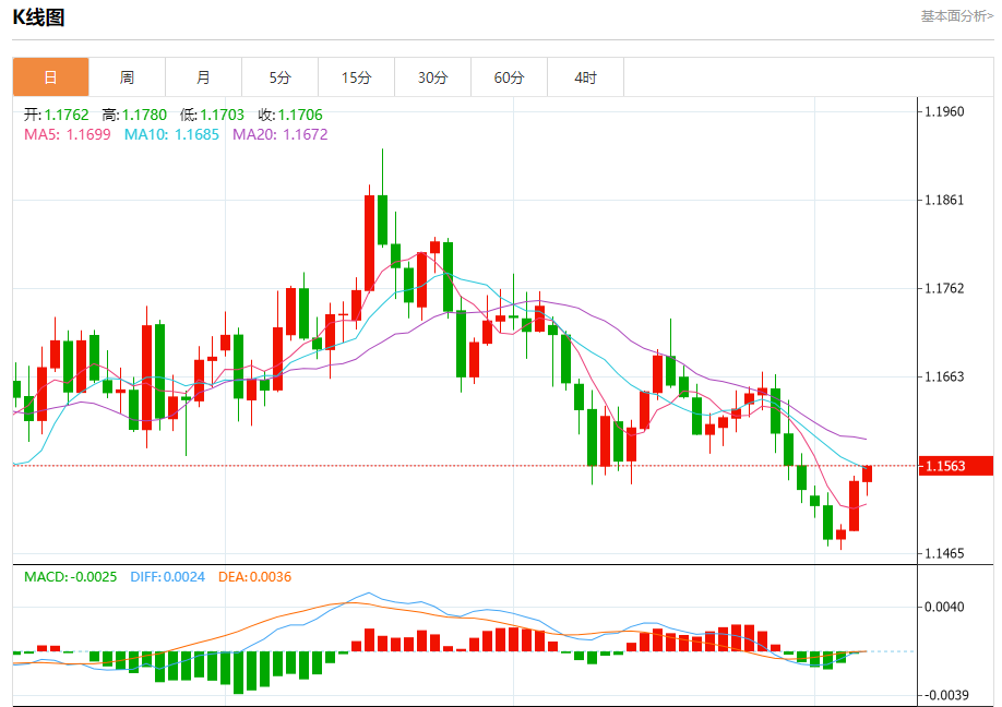 今日周五,截止目前欧元兑美元报1.1565,上涨0.15%。