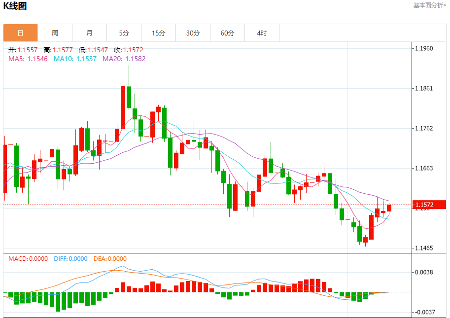 今日周二,截止目前欧元兑美元报1.1572,上涨0.13%。