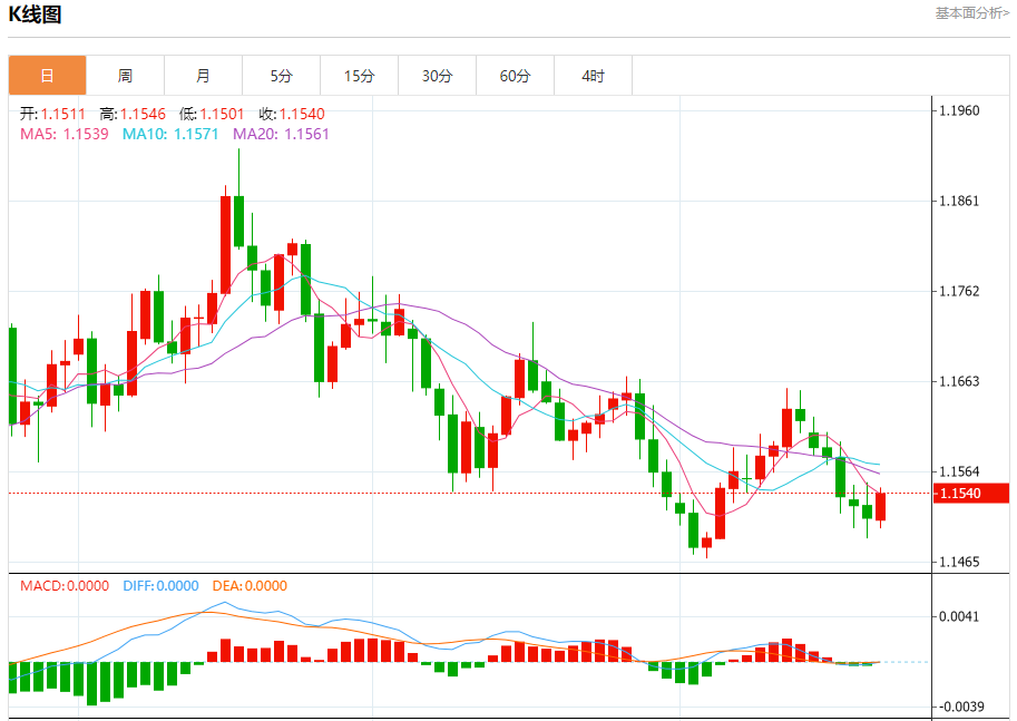 今日周一,截止目前欧元兑美元报1.1541,上涨0.22%。