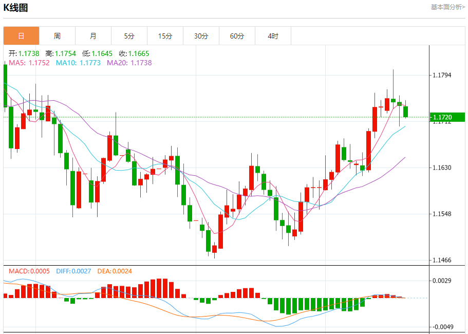 今日周四,截止目前欧元兑美元报1.1721,下跌0.17%。