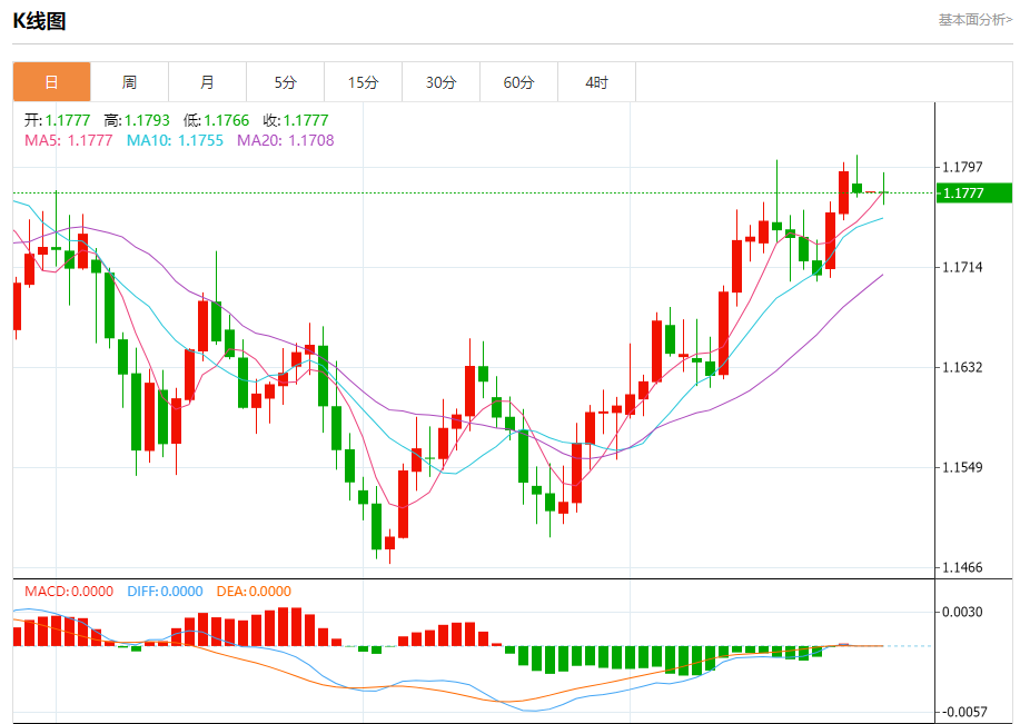 今日周五,截止目前欧元兑美元报1.1778,下跌0.15%。