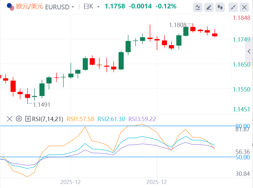 下行方面,欧元兑美元可能在九日均线1.1757找到直接支撑,该均与下行通道边界对齐。跌破通道将削弱短期动能,使该货币对面临50日均线1.1673的测试。进一步下跌可能使价格重试12月1日创下的三周低点1.1589。