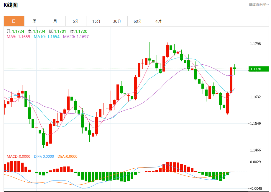 今日周三,截止目前欧元兑美元报1.1721,下跌0.04%。