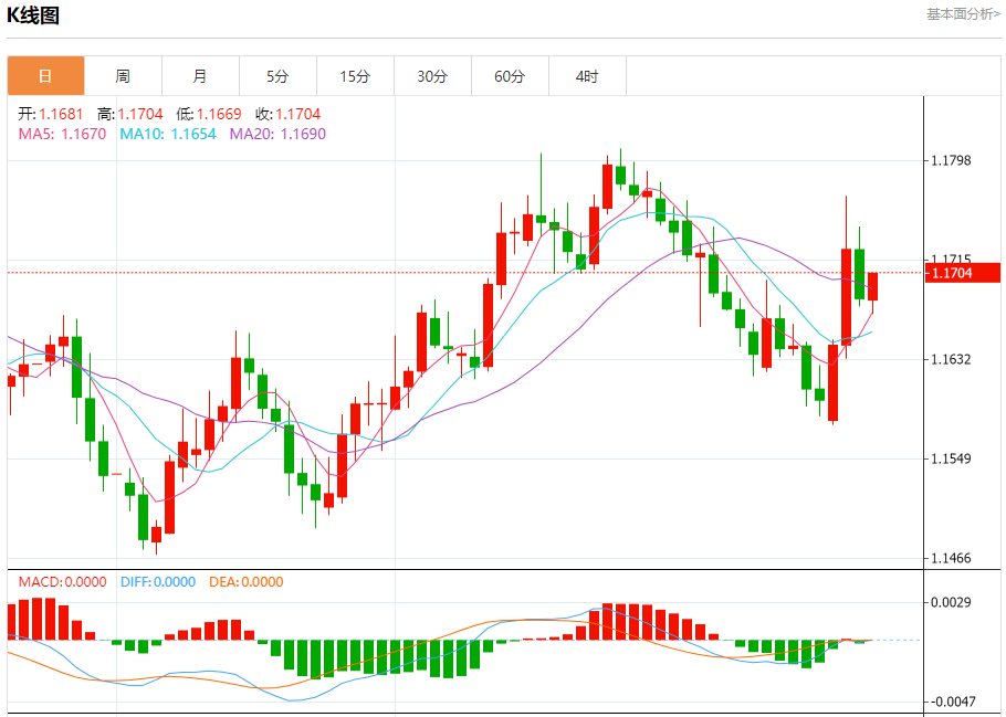 今日周四,截止目前欧元兑美元报1.1704,上涨0.18%。