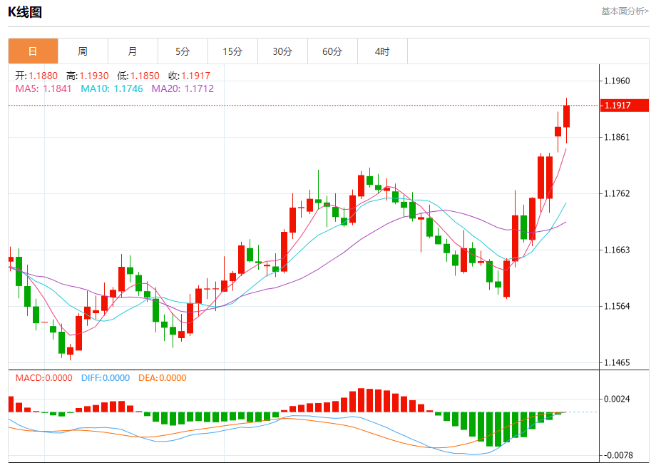今日周二,截止目前欧元兑美元报1.1913,上涨0.28%。